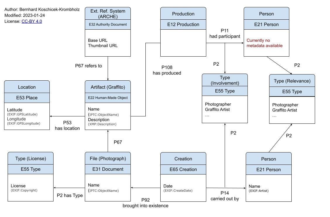 Artifact (E22 Human-Made Object): Graffito, name (IPTC:ObjectName), description (XMP:Description), linked (P67) to ARCHE Reference System (E32)